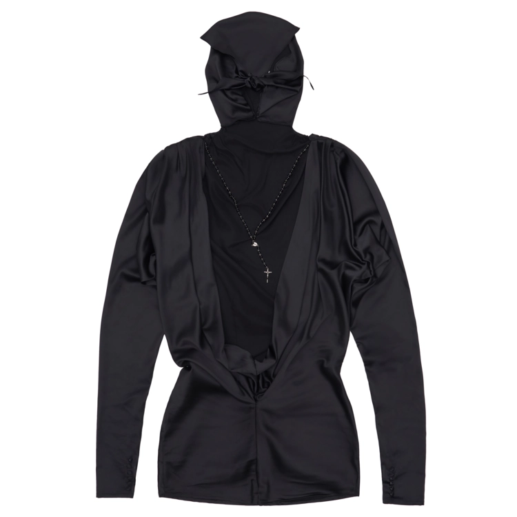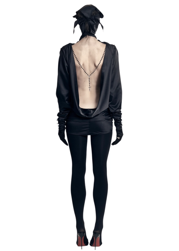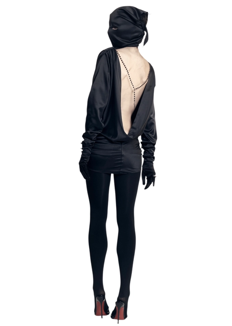 MASKED BACKLESS SILK DRESS W/CROSS EMBELLISHMENT